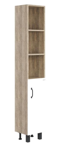 Напольный пенал для ванной комнаты пенал Onika ТИМБЕР 30 удачно сочетает в себе контрастные цвета и фактуры: белый матовый фасад с покрытием SoftTouch, корпус цвета дуб сонома с роскошной текстурой, черная матовая металлическая фурнитура.