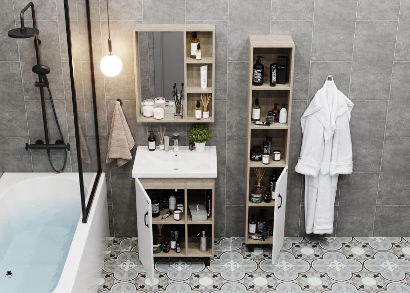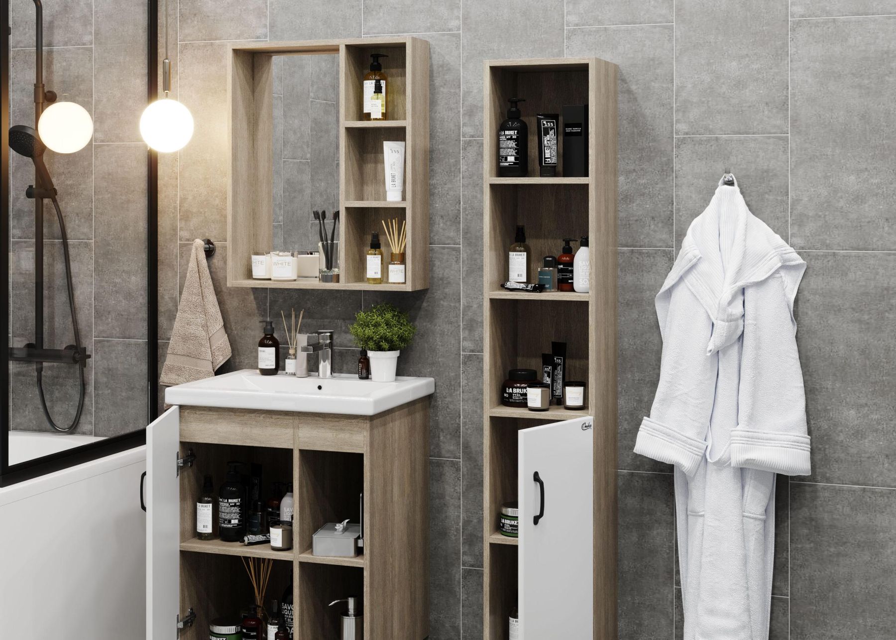 Открытые полки сверху обеспечивают быстрый доступ к часто используемым аксессуарам, а пространство за распашной дверцей снизу, снабженной системой плавного закрывания, станет удобным местом для хранения различных бытовых принадлежностей.