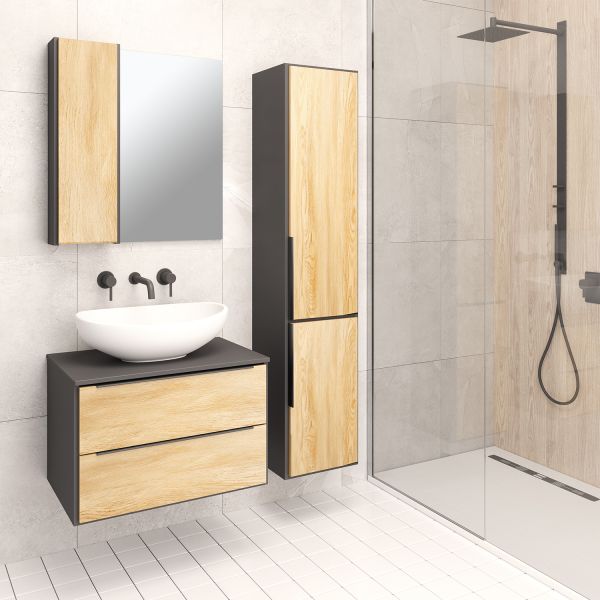 Шкаф-колонна подвесной имеет два отделения с распашными дверками. В верхнем отделении - две встроенные полки, в нижнем - одна. Выпускается только в правом исполнении.