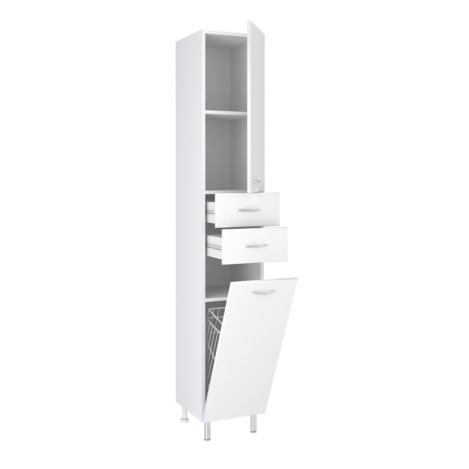 Шкаф-колонна напольный с двумя отделениями и выдвижными ящиками. Верхнее отделение с распашной дверкой и одной внутренней полкой. Нижнее отделение - с откидной дверью. Комплектуется полкой и корзиной для белья. Ящики - на шариковых направляющих, петли со встроенным доводчиком, ручки - 4 шт, ножки хром - 2 шт, ножки пластик -2шт.