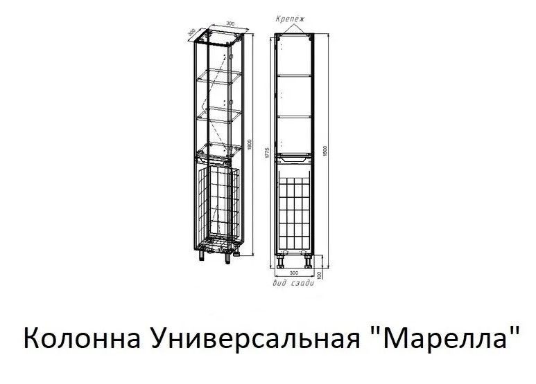 - 1 распашной фасад, 2 полки, бельевая корзина