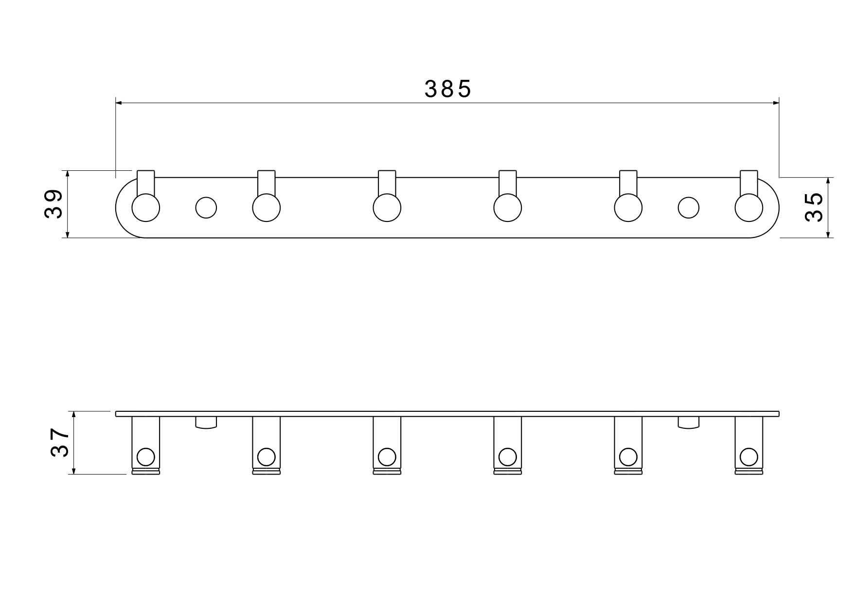 Общий размер (мм): 385*35*37Основной материал: латунь, нержавеющая стальМонтаж: на стенуМетод крепления: шурупыКоличество крючков: 6Назначение: аксессуарыТип продукта: крючок для полотенецГарантия (лет): 5Легкая установка
