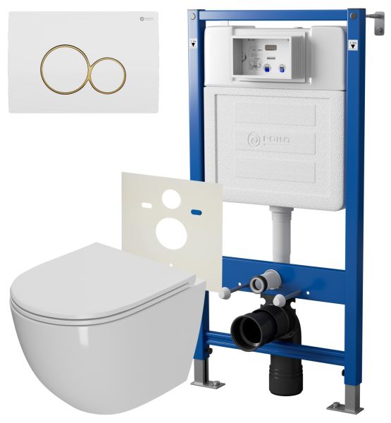 Сет: Система инсталляции Point Элемент для подвесного унитаза PN45120 + Клавиша смыва для инсталляции Point Виктория, белая/золото, PN44061WG + Унитаз подвесной Point Афина безободковый, сиденье микролифт PN41041