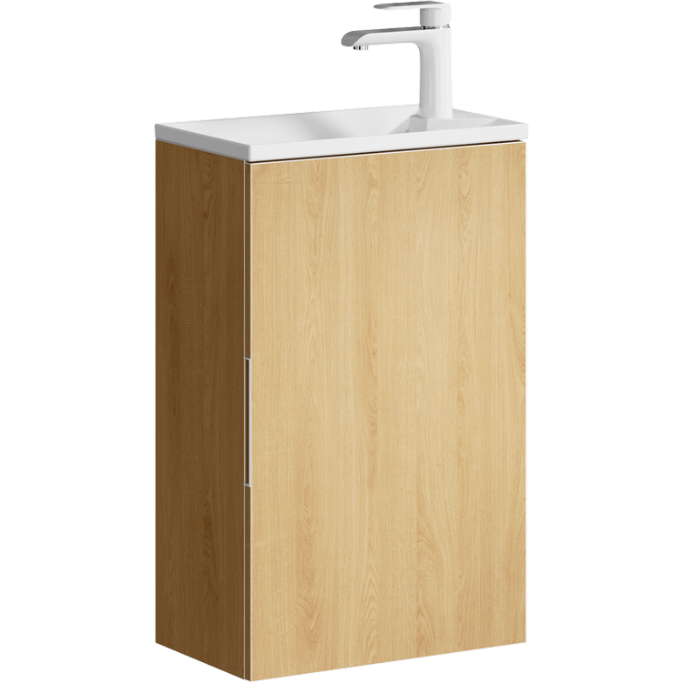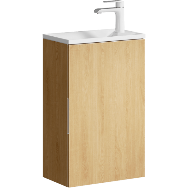Подвесная тумба с одной универсальной левой/правой дверью в цвете дуб золотой с умывальником из литьевого мрамора