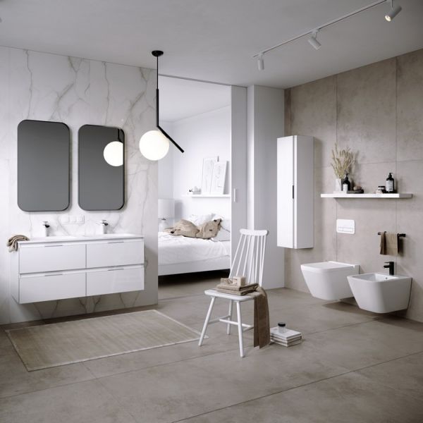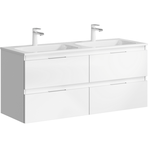 Подвесная тумба с четырьмя ящиками в белом цвете с умывальником из литьевого мрамора