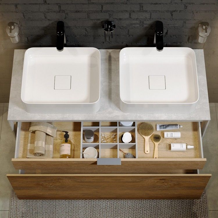Подвесная тумба под раковину Aqwella Mobi MOB0112BS+MOB0712DB 120 смПодвесная тумба 120 см с двумя ящиками: основной и внутренний, скрытый за фасадом. Цвет бетон светлый/дуб балтийский; с умывальником