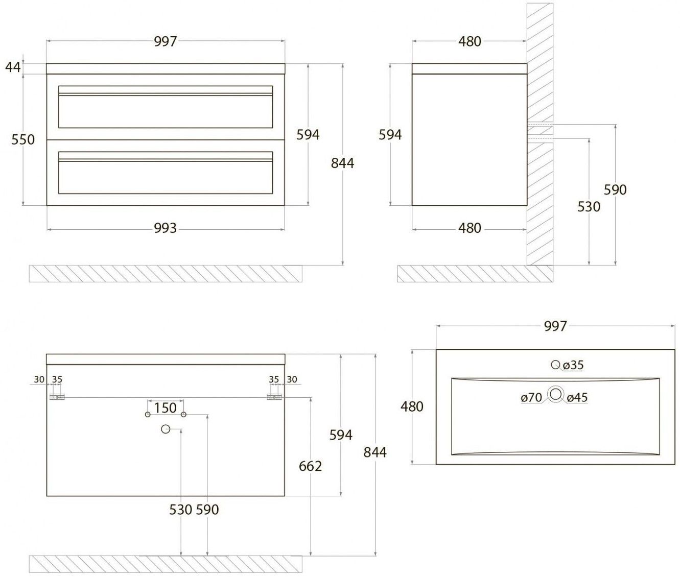 • Рекомендуемая высота от пола: 844 мм