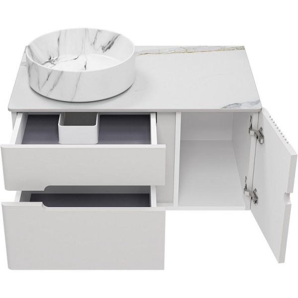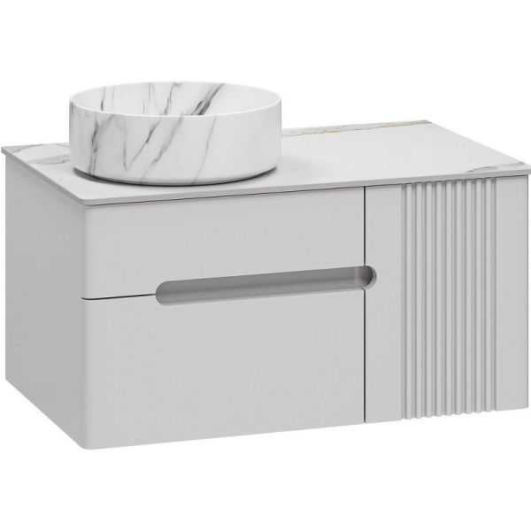 Тумба с раковиной Brevita Pallisandro 80 УТ000025399 подвесная. Pallisandro - когда эстетика встречается с функциональностью. Коллекция создана для ценителей утончённого дизайна и продуманных деталей. Здесь всё подчинено принципу элегантного минимализма: лаконичные фасады в эмали, изысканная фрезеровка на дверце и отсутствие внешней фурнитуры для чистоты линий. Главный акцент коллекции — столешницы из керамогранита, устойчивые к влаге, механическим повреждениям и химическим веществам. Накладные раковины гармонично завершают современный образ. Внутреннее пространство продумано до мелочей: ящики оснащены доводчиками скрытого монтажа, что обеспечивает плавное закрывание, а противоскользящие коврики внутри ящиков позволяют хранить вещи в идеальном порядке. Благодаря  подвесному монтажу, мебель смотрится легко, а уборка становится удобнее. Pallisandro - это премиальный комфорт, который чувствуешь в каждой детали. Характеристики: Тумба под раковину: