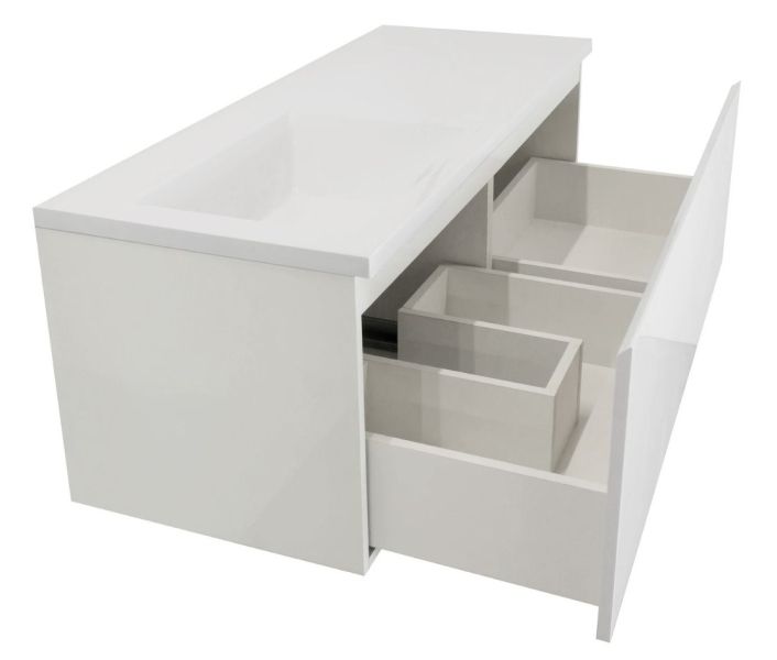 Отличительной особенностью коллекции Dallas Luxe является один большой функциональный ящик, который располагается по всей длине раковины. Ящик разделяется на две зоны, тем самым дает возможность хранения как крупных, так и мелких вещей. Стильная тумба впишется в любой современный интерьер и создаст комфорт в использовании. Подвесная система монтажа позволяет более эффективно использовать пространство, не мешает уборке в ванной комнате, не нарушает раскладку плитки на полу.