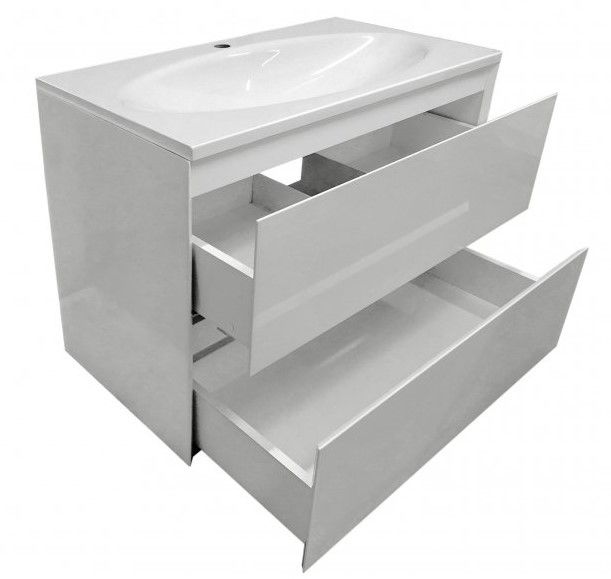 К тумбе приобретается раковина из литьевого мрамора, плавно перетекающая в овальную чашу, которая добавляет изящность мебели и передает атмосферу стиля. В тумбе расположены 2 вместительных ящика, интегрированные ручки выполнены за счет скошенных фасадов. Мебель выполнена из влагостойкого ЛДСП и качественного MDF с использованием эмали RENNER (Италия). Ящики снабжены системой плавного закрывания. Для мебели используется фурнитура Samet (Турция).