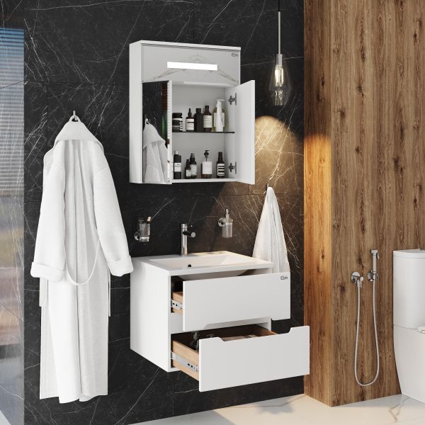 Корпус тумбы выполнен из ЛДСП, фасады ящиков - из ЛМДФ в пленке, устойчивых к механическим воздействиям, перепадам температур и высокой влажности. Тумба надежно крепится к стене и не занимает место на полу, не создавая при этом сложностей в уборке ванной комнаты.