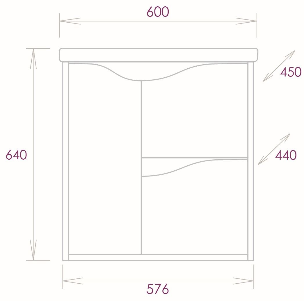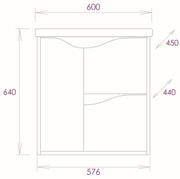 Размеры тумбы без учета раковины и ножек: 57x44x60 см.
