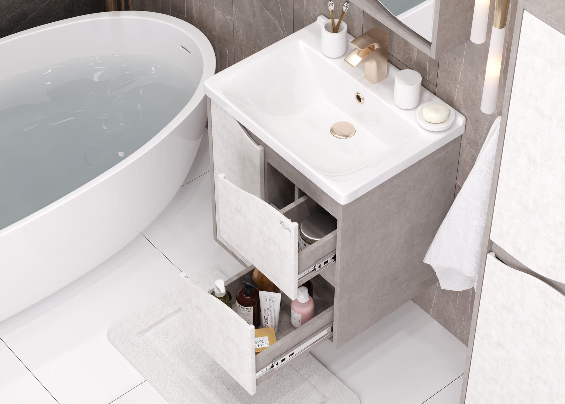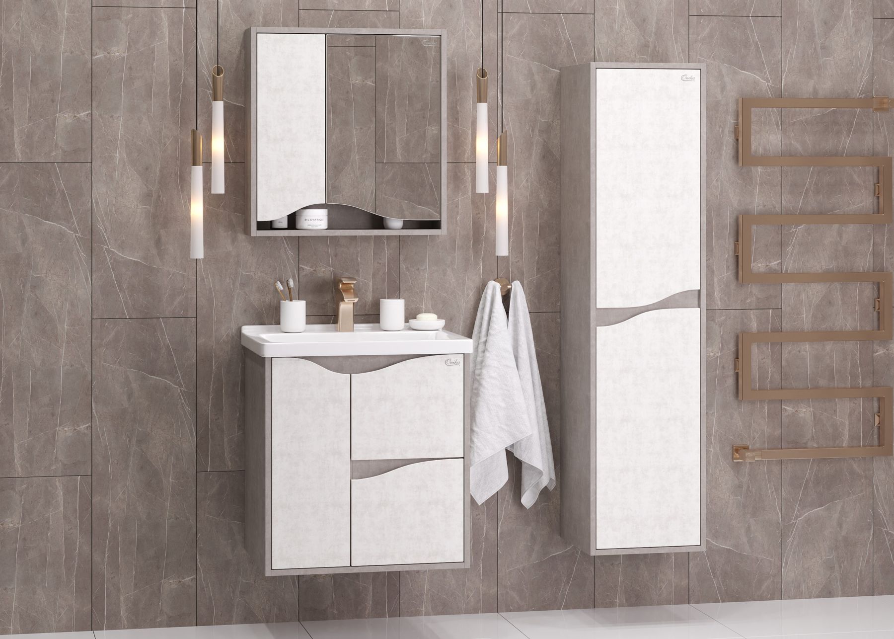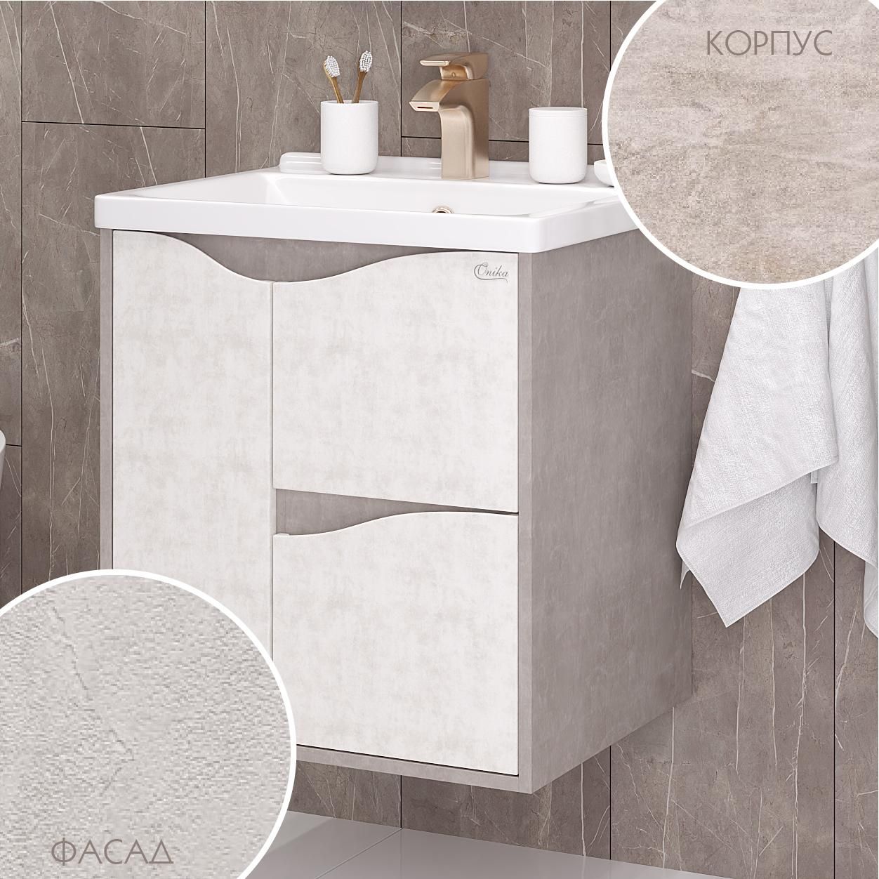 Подвесная тумба для ванной комнаты Onika Брендон 60 поможет создать особенную атмосферу ванной комнаты: текстуры камня и бетона гармонично дополняют друг-друга, создавая сдержанный выразительный акцент в интерьере.