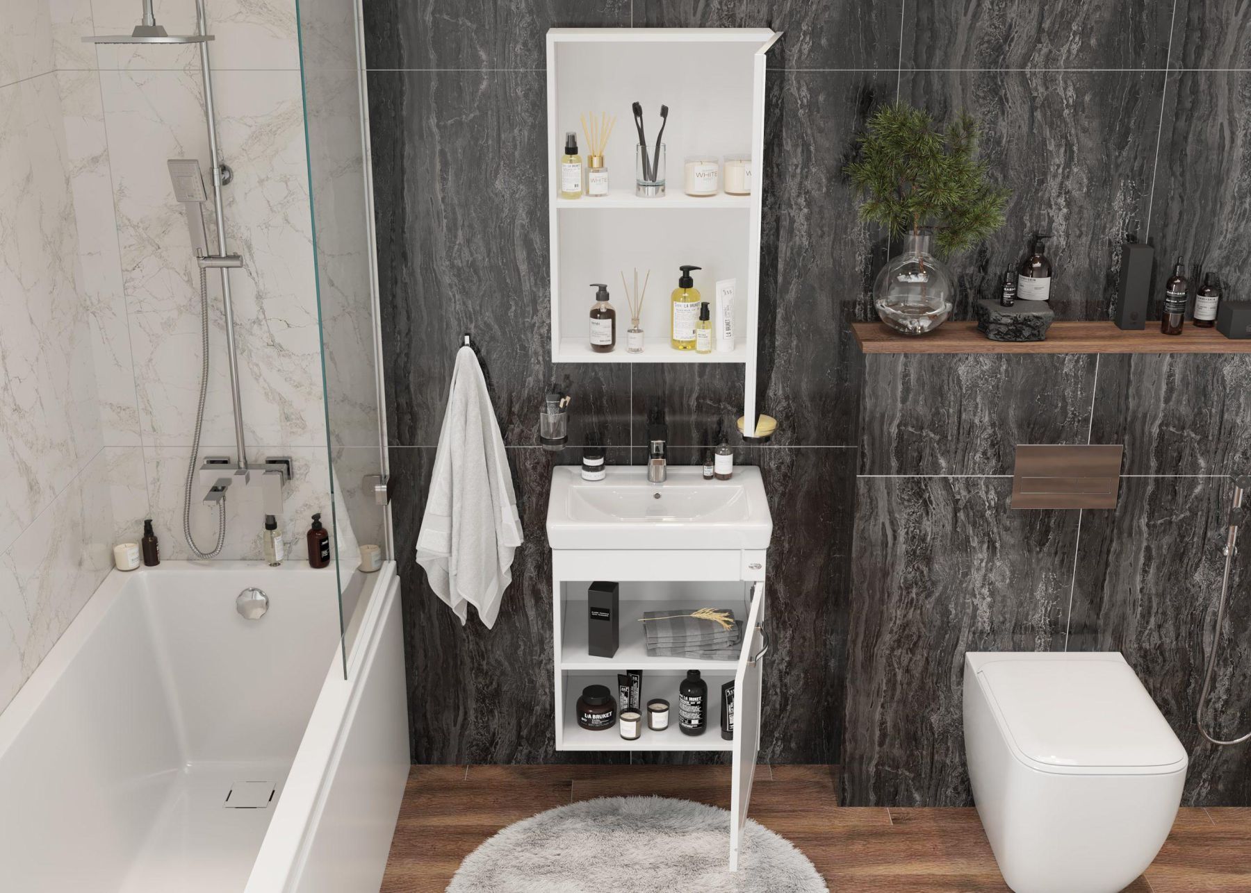 Подвесная конструкция и компактные габариты подойдут для оформления небольшого пространства, а простой дизайн с изящной фрезеровкой и сверкающей дизайнерской ручкой гармонично впишется в любую ванную комнату.