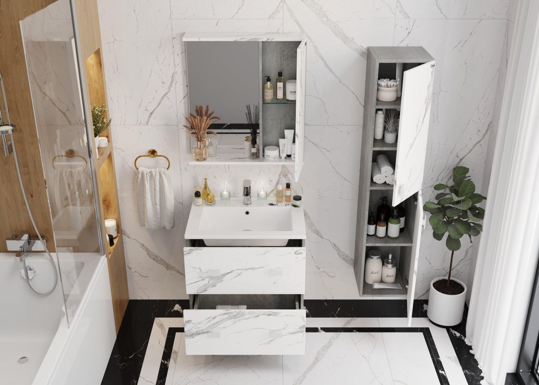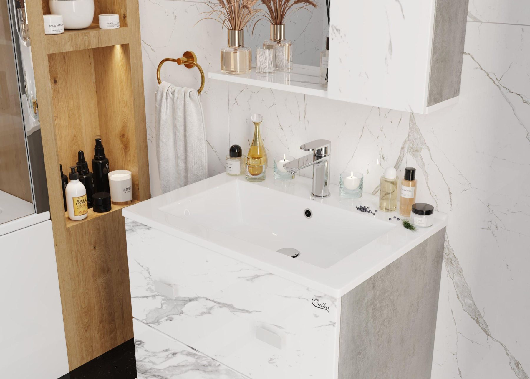 Белые матовые ручки практически не заметны на фасаде и не отвлекают взгляд от текстуры мрамора.