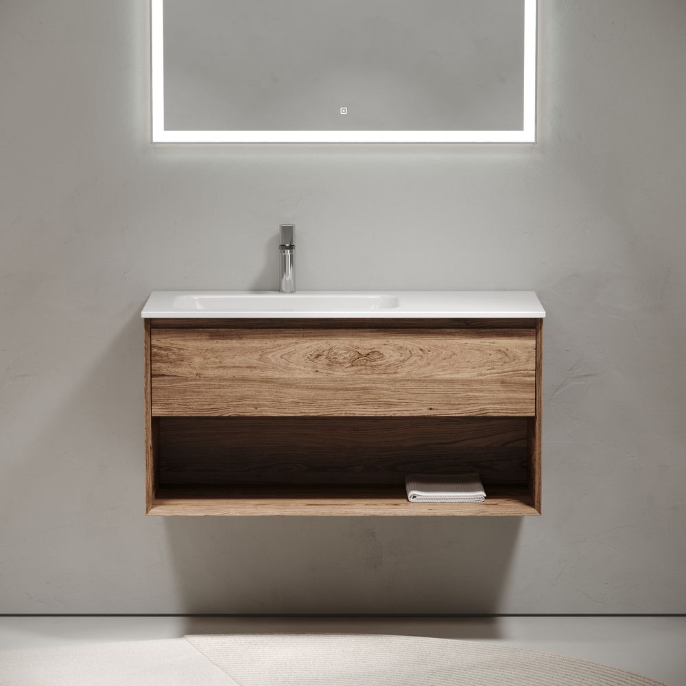 Тумба подвесная SANCOS Marmi 1.0 левая, 995х445х520 левая, c одним ящиком оснащенным доводчиками скрытого монтажа с системой Soft close (плавного закрывания) и открытой нишей, c фрезерованной ручкой по всей длине фасада, дуб чарльстон, арт.MR1.0100LECH