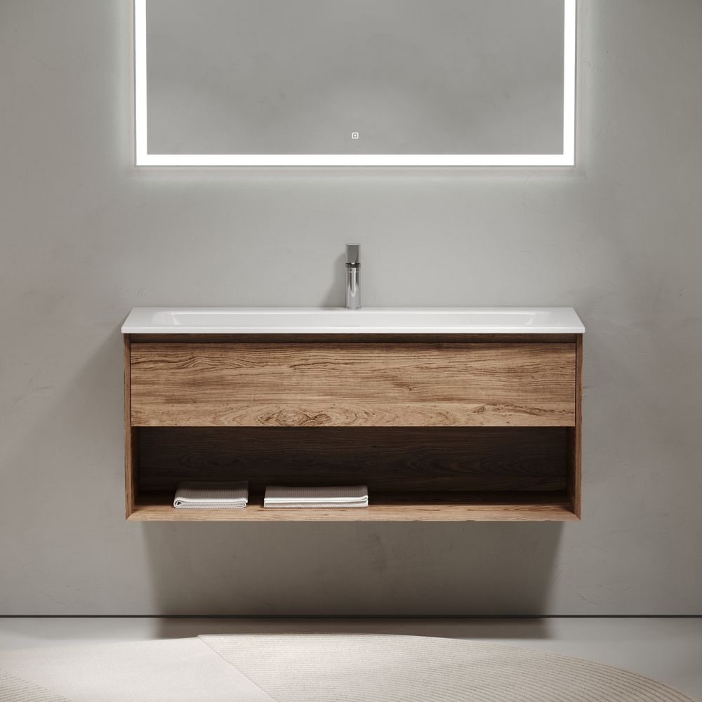 Тумба подвесная SANCOS Marmi 1.0 1195х445х520 c одним ящиком оснащенным доводчиками скрытого монтажа с системой Soft close (плавного закрывания) и открытой нишей, c фрезерованной ручкой по всей длине фасада, дуб чарльстон, арт.MR1.0120ECH