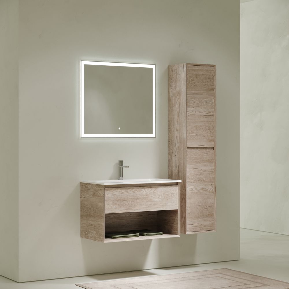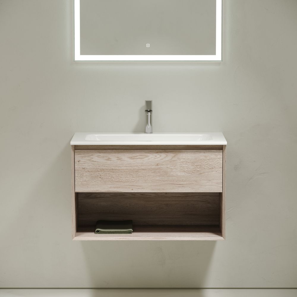 Тумба подвесная SANCOS Marmi 1.0 790х445х520 c одним ящиком оснащенным доводчиками скрытого монтажа с системой Soft close (плавного закрывания) и открытой нишей, c фрезерованной ручкой по всей длине фасада, дуб галифакс натуральный, арт. MR1.080EG