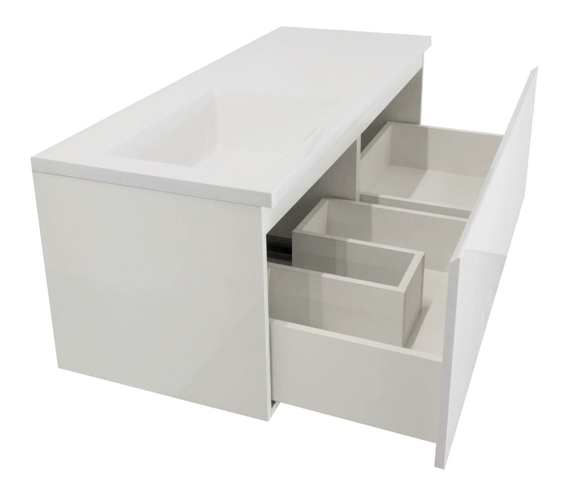 Отличительной особенностью коллекции Dallas Luxe является один большой функциональный ящик, который располагается по всей длине раковины. Ящик разделяется на две зоны, тем самым дает возможность хранения как крупных, так и мелких вещей. Стильная тумба впишется в любой современный интерьер и создаст комфорт в использовании. Подвесная система монтажа позволяет более эффективно использовать пространство, не мешает уборке в ванной комнате, не нарушает раскладку плитки на полу.