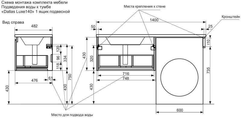 Подвесная тумба с раковиной Эстет Dallas Luxe ФР-00002925 П 140см длинный ящик белый