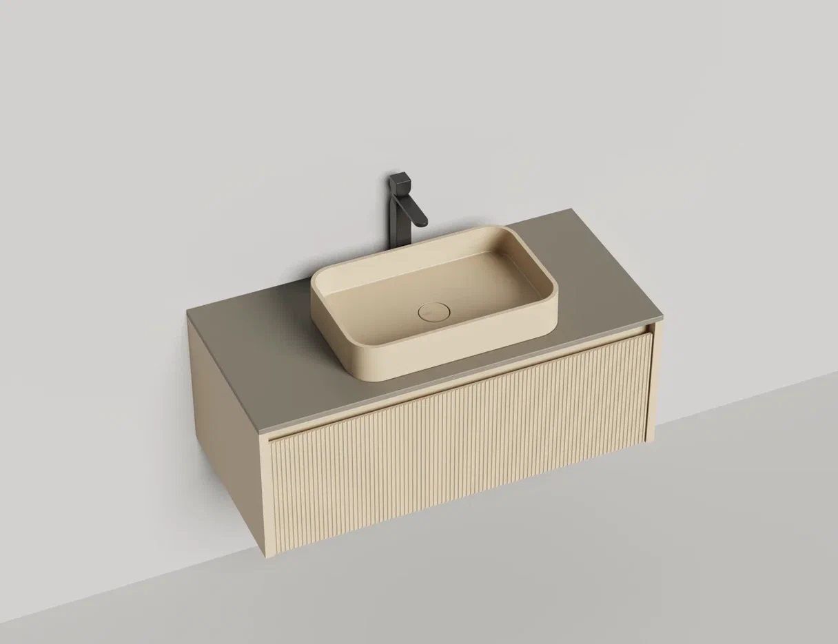 • Тумба и столешница из материала S-Stone в сборе (накладные раковины укомплектованы донным клапаном и поставляются в отдельной коробке)