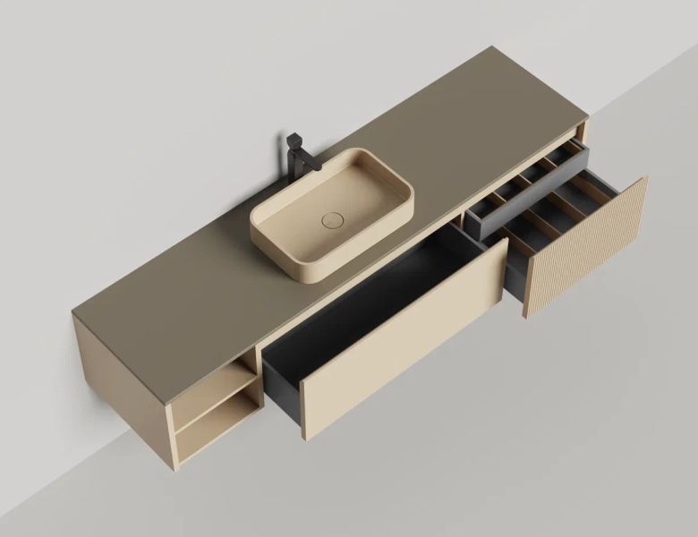 Наполнение для тумбы включает: блоки ячеек для тумб, коврики и комплект внутренней подсветки, которые помогут организовать пространство и создать более удобный доступ к вещам.Тумба DOMINO, дополненная столешницей COSTA из каменного литья S-Stone, гарантирует практичность и простоту ухода.