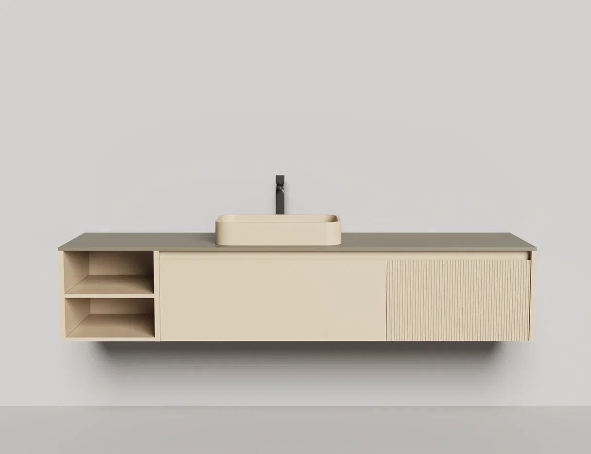 • Тумба и столешница из материала S-Stone в сборе (накладные раковины укомплектованы донным клапаном и поставляются в отдельной коробке)