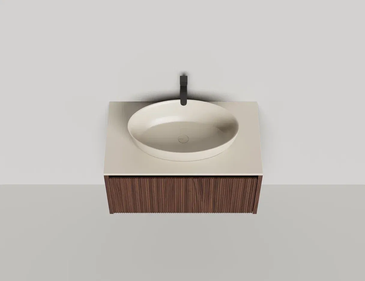 • Тумба и столешница из материала S-Stone в сборе (накладные раковины укомплектованы донным клапаном и поставляются в отдельной коробке)