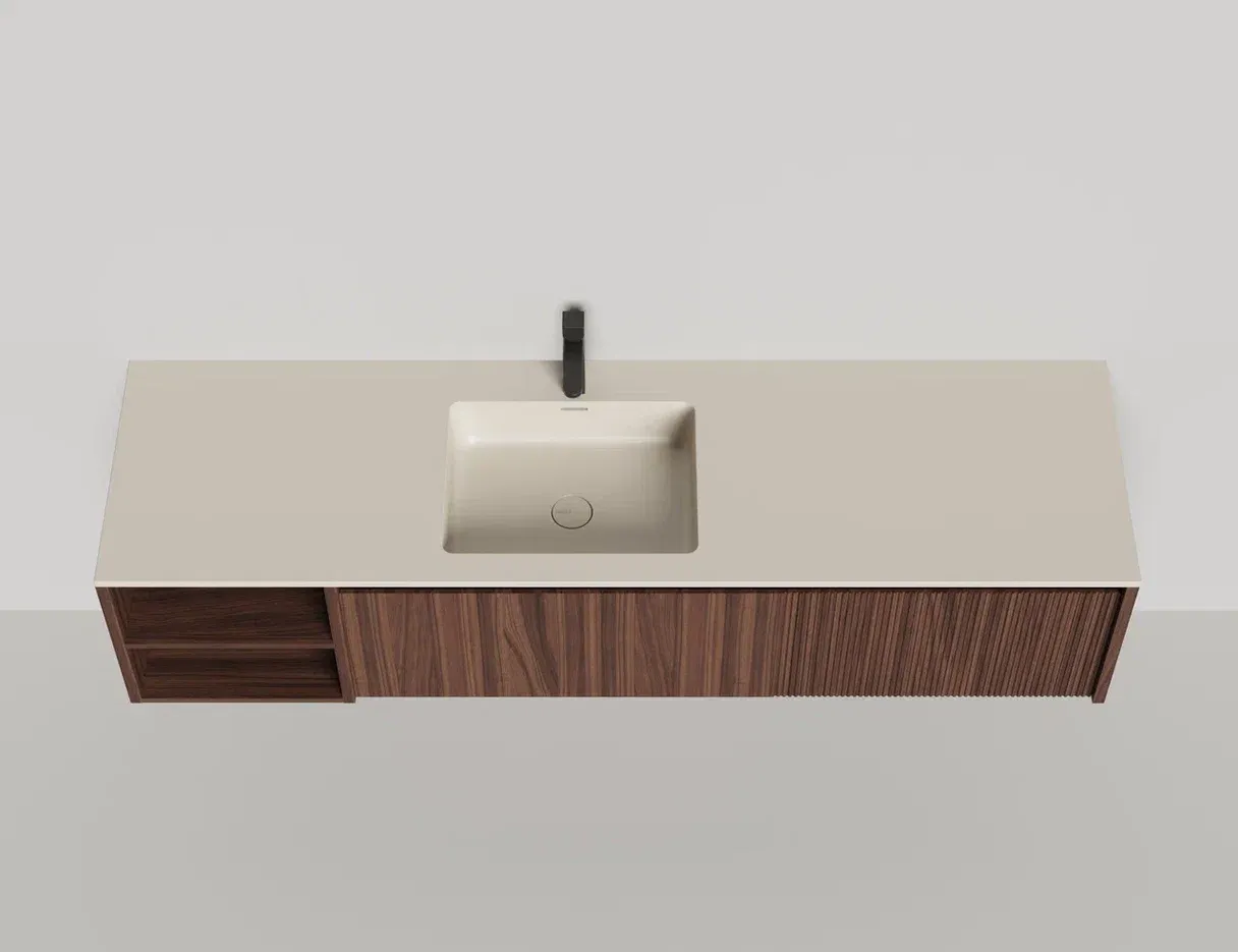 • Тумба и столешница из материала S-Stone в сборе (накладные раковины укомплектованы донным клапаном и поставляются в отдельной коробке)