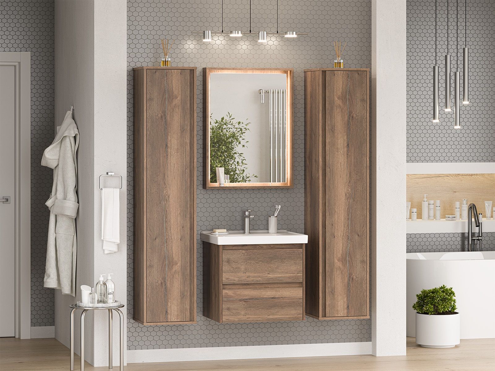 Шкаф-пенал для ванной комнаты – это стильное решение, которое гармонично вписывается в современный интерьер. Его элегантные линии и аккуратные формы создают атмосферу чистоты и порядка, что особенно важно в таком интимном пространстве. Изготовленный из качественных влагостойких материалов, этот шкаф обеспечивает долговечность и надежность, даже в условиях повышенной влажности.Основное преимущество шкаф-пенала заключается в его вместительности. Удобные полки и ящики позволяют организовать пространство и разместить все необходимое: от косметики до бытовых принадлежностей. Каждая деталь продумана для удобства использования, что делает утренние и вечерние ритуалы более приятными.Будь то строгий минимализм или уютный скандинавский стиль, шкаф-пенал станет акцентом, который подчеркивает индивидуальность вашего пространства. Не упустите возможность преобразить свою ванную комнату, добавив в нее этот элегантный и практичный элемент.