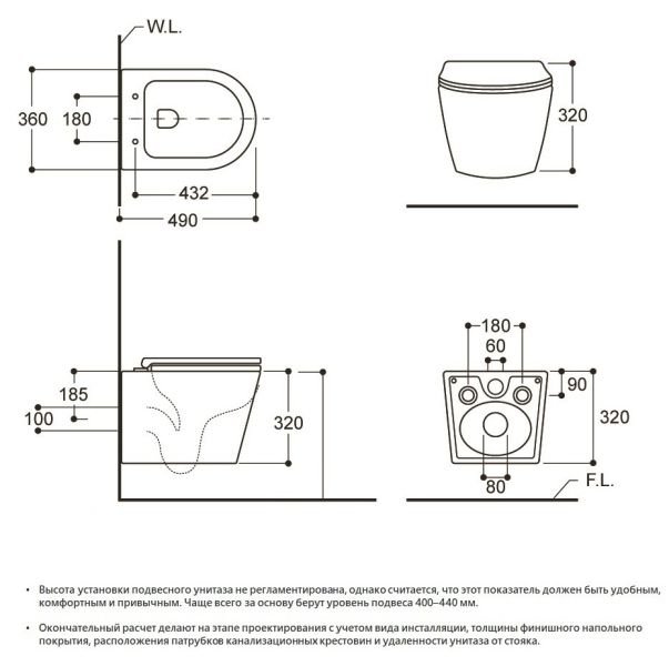 Подвесной безободковый унитаз с системой скрытого монтажа, крышкой-сидением из дюропласта с функцией soft-close и quick release.