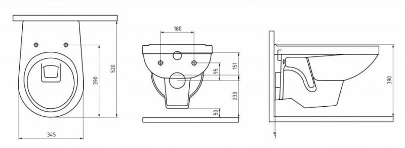 • Прилегание унитаза к стене: