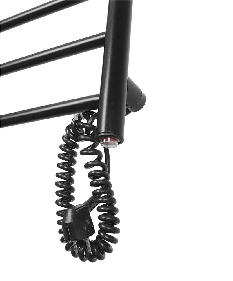 Полотенцесушитель электрический Domoterm Аврора 109-5 EK R/EK L, ширина 50 см, высота 70 см, подключение слева/справа, черный матовый, DMT 109-5 50x71 ЧРН EK R/DMT 109-5 50x71 ЧРН EK LЭлектрический полотенцесушитель с ТЭНом представляет собой современный обогревательный электроприбор из нержавеющей стали. Устройство потребляет небольшое количество электроэнергии и может работать на протяжении длительного периода времени без отключения от сети; является дополнительным источником отопления в комнате, можно использовать в ванных комнатах для сушки белья, полотенец. Полотенцесушители поставляются в сборе, укомплектованы монтажными стойками и готовы к установке. Толщина 1,5 мм. Вертикальные стойки имеют диаметр 32мм., горизонтальные перекладины выполнены из трубы диаметром 18мм