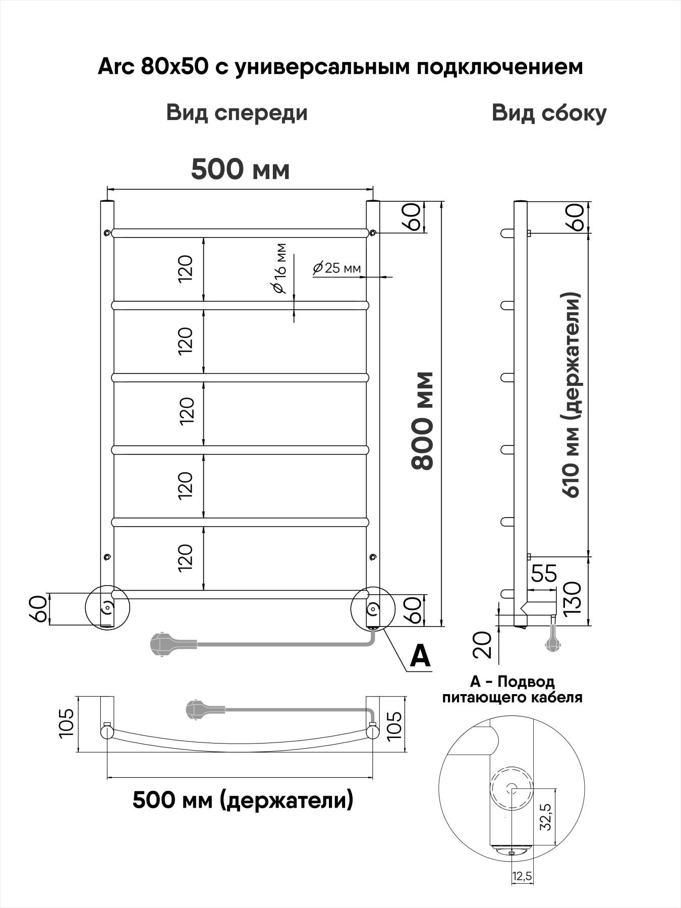 Полотенцесушитель электрический INDIGO Arc в виде лесенки. Модель оснащена кнопкой включения на нижней части стойки. Универсальность изделия предусматривает подключение через прямой провод, который переставляется на нужную вам сторону или скрытое подключение без покупки дополнительного переходника. Длина прямого провода 1,1 метра.