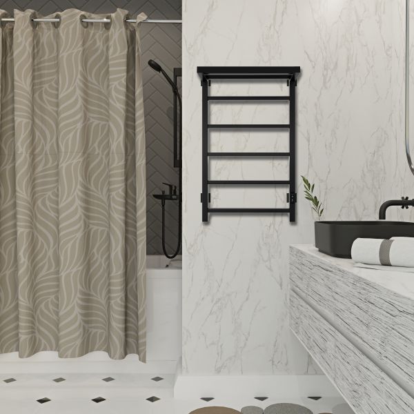 Компактный, красивый полотенцесушитель с терморегулятором в цвет. Полотенцесушитель дополнен полкой и в этом его преимущество, так как это дополнительное место для сушки полотенец, помогает организовать пространство в ванной комнате. Благодаря электрическому полотенцесушителю вы избавитесь от повышенной влажности в ванной, которая способствует появлению плесени.  Модель имеет терморегулятор нагрева, у которого три режима: 40, 45, 50 градусов и таймер на отключение через 2, 4, 6 часов. Универсальность изделия предусматривает подключение через прямой провод или скрытое подключение без покупки дополнительного переходника.  Длина прямого провода 1,1 метра. В комплектации идут 4 телескопических держателя, комплект монтажа и гарантийный паспорт на 3 года.
