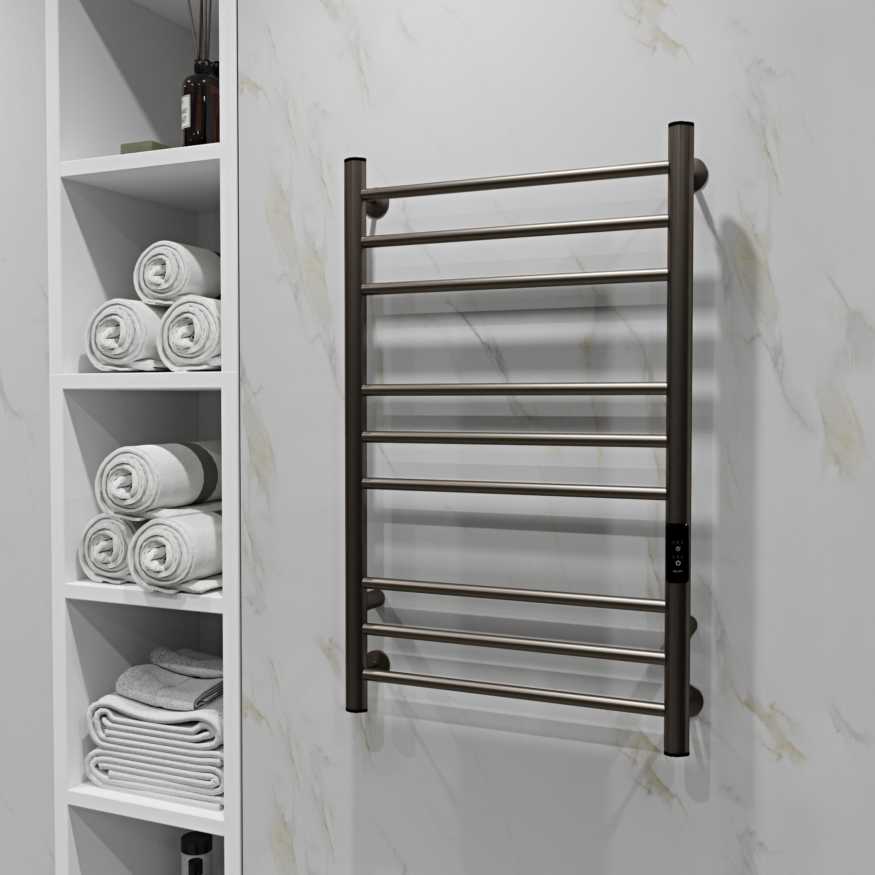 Полотенцесушитель электрический имеет встроенный терморегулятор нагрева, у которого три режима: 40, 45, 50 градусов и таймер на отключение через 2, 4, 6 часов.