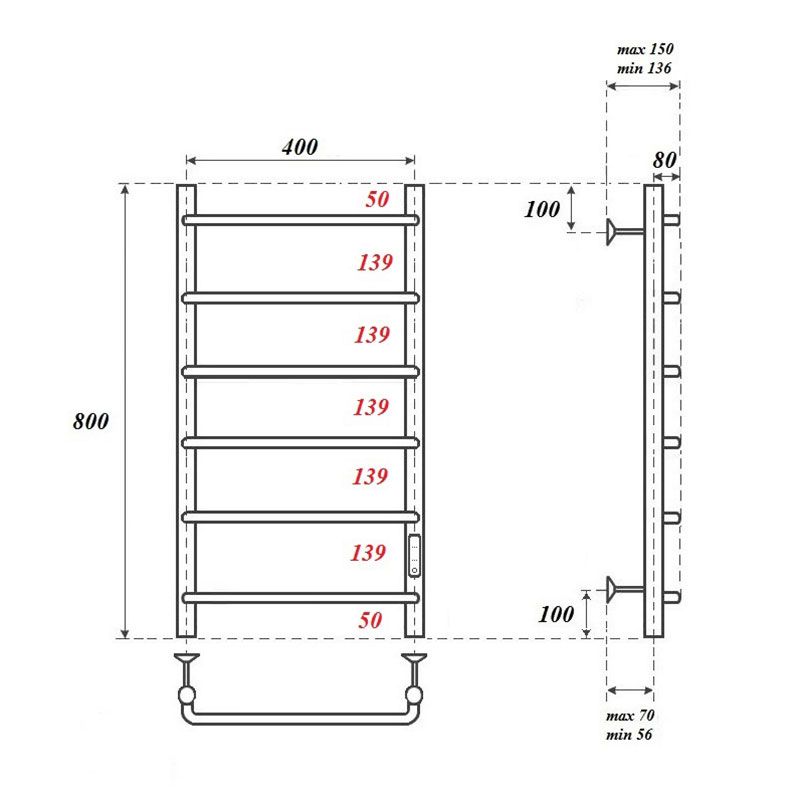 Полотенцесушитель электрический Point PN08848 П6 400x800 диммер справа, хромКомплектация: