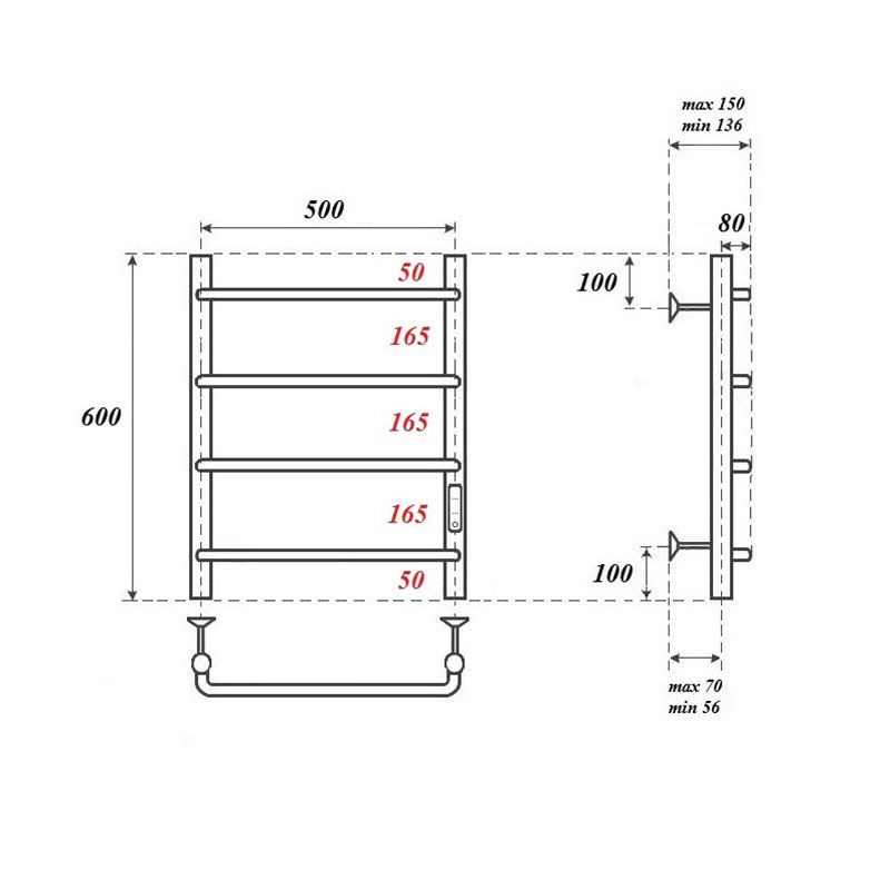 Полотенцесушитель электрический Point PN08856 П4 500x600 диммер справа, хромКомплектация: