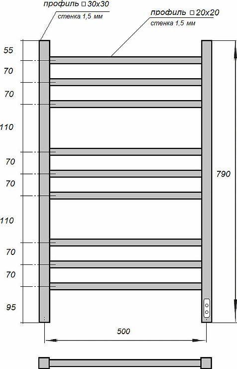 Полотенцесушитель электрический Point PN71858B П9 500x800, диммер справа черный