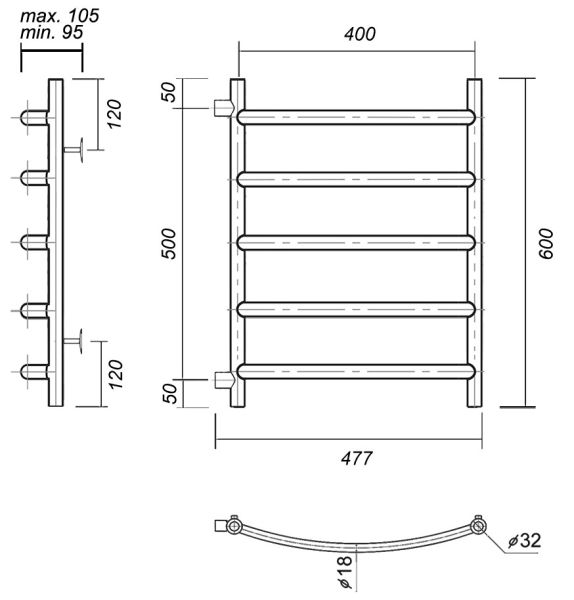 М/о расстояние (межосевое расстояние): 500Количество перекладин: 5Коллекция: КалипсоТип: водяныеЦвет: хромШирина (мм): 477Высота (мм): 600Глубина (мм): 105-95Вес: 3,9Объем: 0,003Тэн/подключение: боковоеСтрана: РоссияГарантия: 10 лет