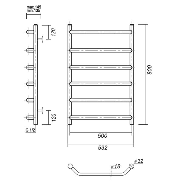 М/о расстояние (межосевое расстояние): 500Количество перекладин: 6Коллекция: ЛаураТип: водяныеЦвет: хромШирина (мм): 532Высота (мм): 800Глубина (мм): 145-135Вес: 5,89Объем: 0,070Страна: РоссияГарантия: 10 лет