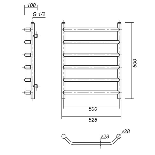 Водяной полотенцесушитель из латуни марки Л59.Цвет «Античная бронза».Труба цельнотянутая.Вертикальные стойки имеют диаметр 28 мм., горизонтальные перекладины выполнены из трубы диаметром 28 мм.Подключение к ГВС нижнее, резьба внутренняя, 1/2".Поставляется с комплектом фитингов для подключения к воде