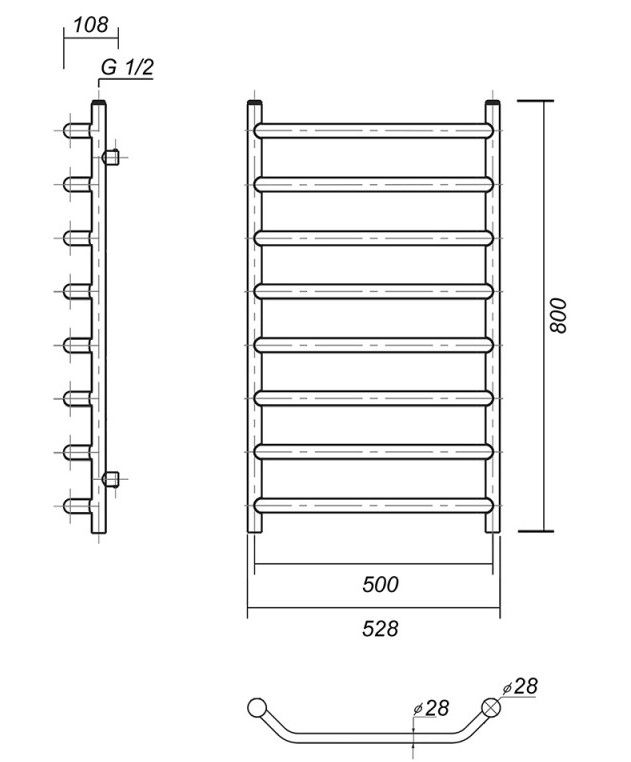 Водяной полотенцесушитель из латуни марки Л59. Цвет «Античная бронза».Труба цельнотянутая.Вертикальные стойки имеют диаметр 28 мм., горизонтальные перекладины выполнены из трубы диаметром 28 мм.Подключение к ГВС нижнее, резьба внутренняя, 1/2".Поставляется с комплектом фитингов для подключения к воде