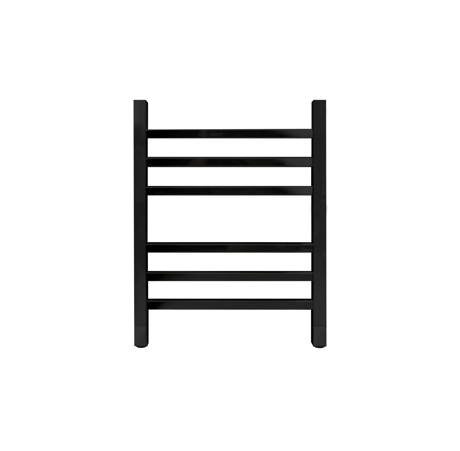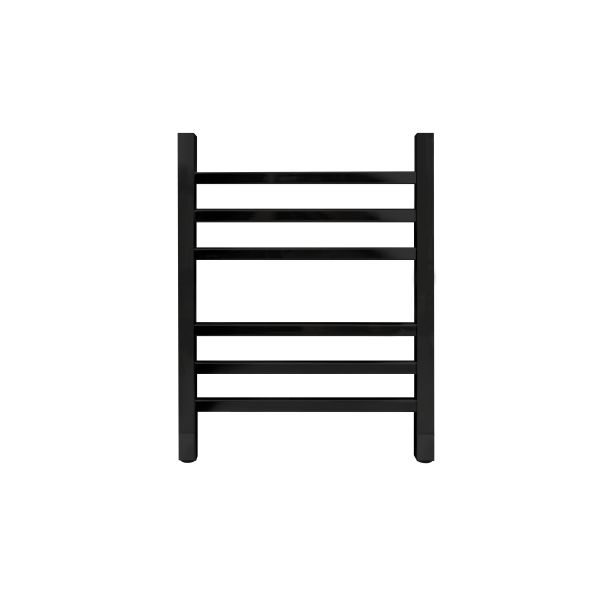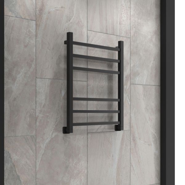 Полотенцесушитель водяной INDIGO Aletto в цвете «Черный Муар» в виде классической лесенки, но при этом коллектор и перекладины выполнены из квадратной трубы.