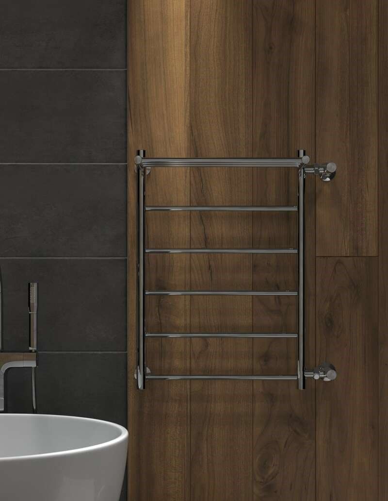 Водяной полотенцесушитель в форме Лесенки Line с полочкой – это оригинальный элемент не только с прямыми или накладными перекладинами, но и дополнительной полкой для полотенец, халатов и других мелочей.