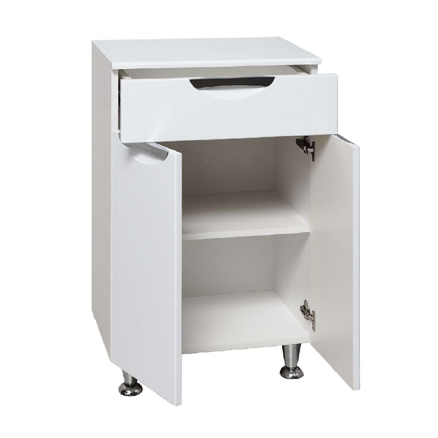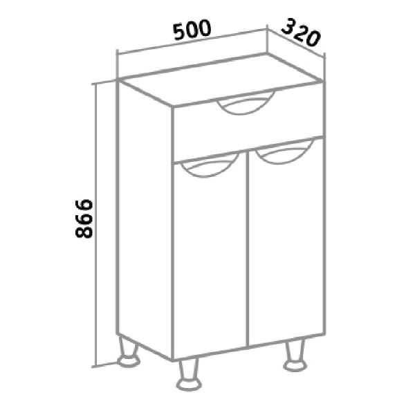 Тумба в ванную (полупенал) с одним выдвижным ящиком и двумя распашными дверками, за которыми одна встроенная полка. Петли со встроенным доводчиком, ручки врезные - 3шт, ножки хром - 2шт, ножки пластик -2шт.