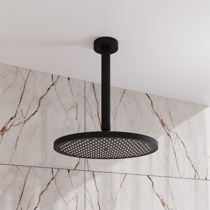 Черный матовый потолочный кронштейн для верхней душевой лейки. Цилиндрическая форма, длина 200 мм. Надежно зафиксирует лейку в необходимом положении, позволяя насладиться тропическим душем. Место крепления кронштейна скрыто круглым декоративным отражателем, что обеспечивает привлекательный внешний вид всей конструкции.