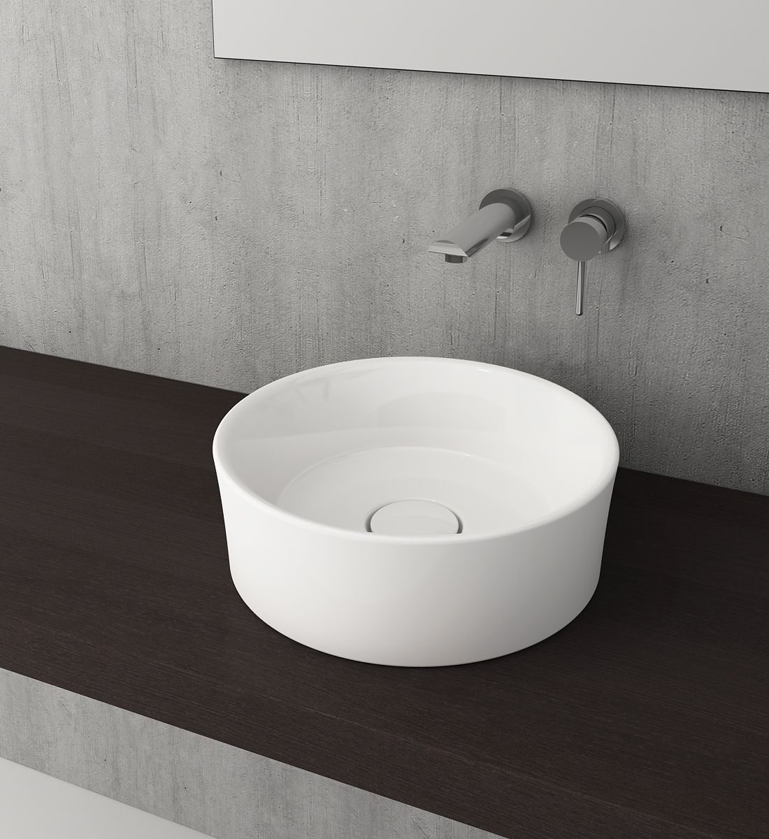 Накладная раковина из санфарфора Berges Mascon диаметром 38 см.Высота 12,5 см.Круглой формы, без отверстия под смеситель, глянцевая белая.Керамическая крышка слива в комплекте.