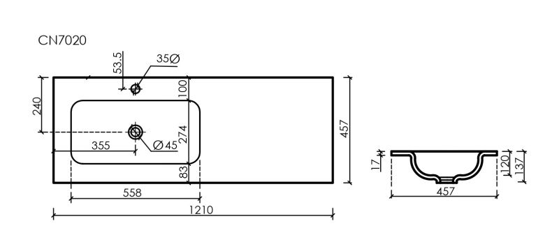 Раковина накладная мебельная CERAMICANOVA Grace прямоугольная 1210x457x137 мм, с чашей слева и отверстием под смеситель, цвет белый CN7020