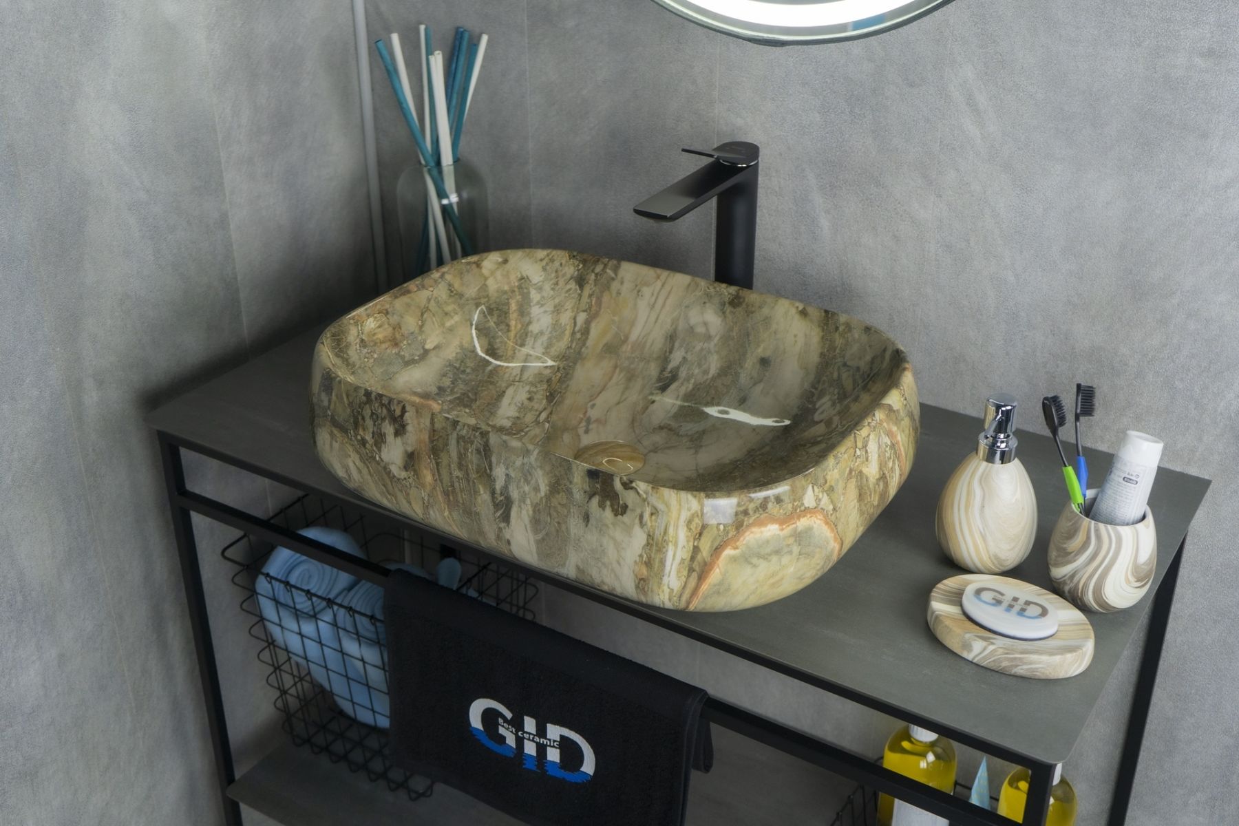 Серия Geometrico с прямоугольной формой: стиль и практичность с испанским качеством и европейскими стандартами. Раковина накладная GiD Mnc186 — элегантная модель, изготовленная из высококачественной керамики с глянцевой поверхностью, имитирующей текстуру натурального камня. Её изысканный дизайн и коричневые оттенки придают ванной комнате современный и утончённый вид. Раковина предназначена для установки на столешницу, что подчёркивает её стиль и функциональность. Модель не имеет отверстия под смеситель, что позволяет использовать различные варианты настенных или встраиваемых смесителей, предоставляя свободу в дизайне интерьера.
